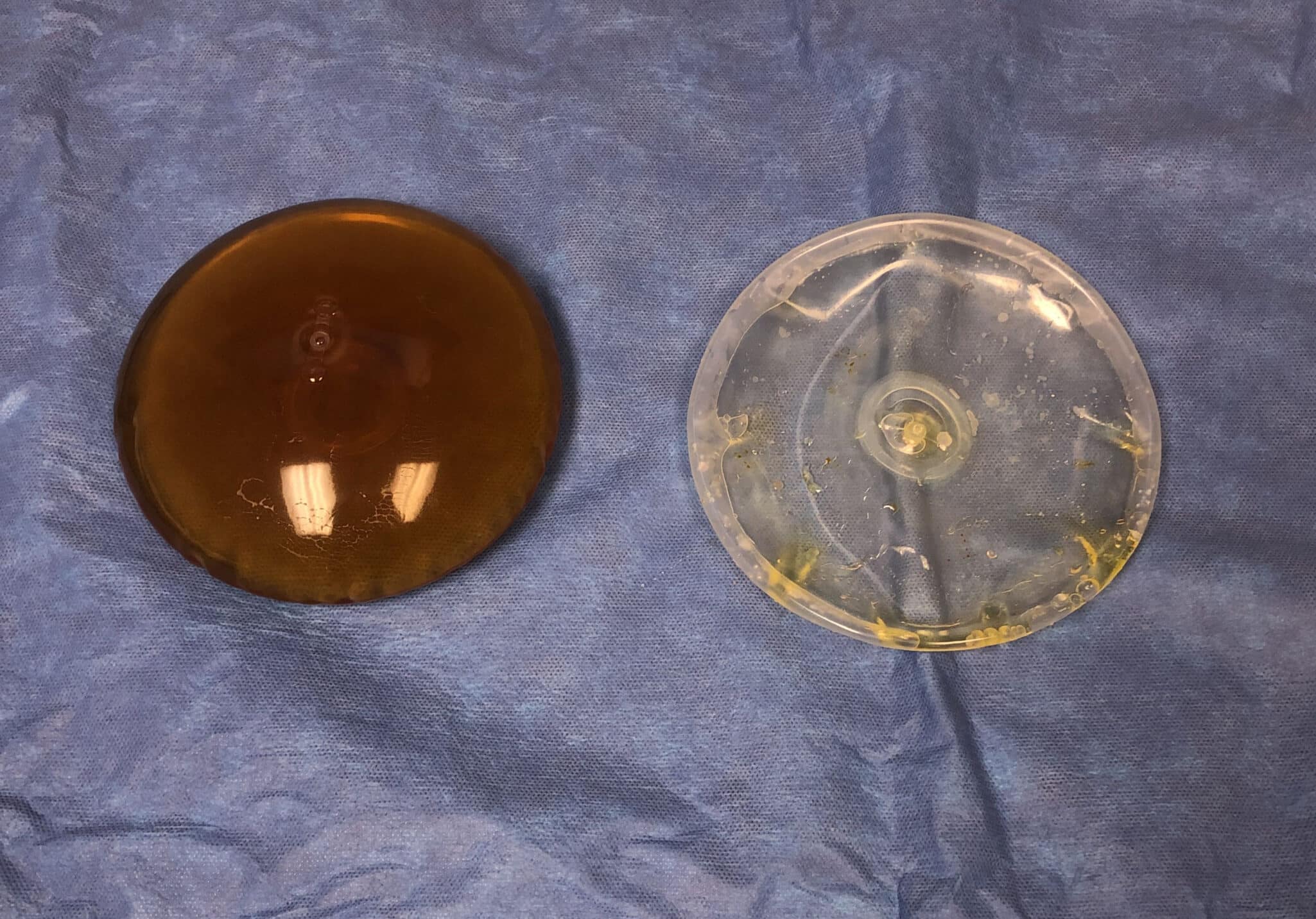 Description: Photo of the removed implants. Her left had been filled with saline + Betadine, a brown color antiseptic. Her right was fully deflated. Betadine colored saline has mistakenly been interpreted as mold. Do not be confused, Betadine added to a saline implant was common 20 years ago and is harmless.