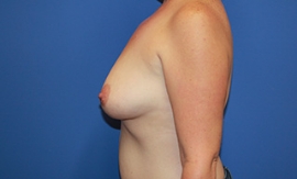 Description: 3 months after breast augmentation with 550 cc smooth round saline submuscular implants. Inframammary crease incision. B cup to DD cup.