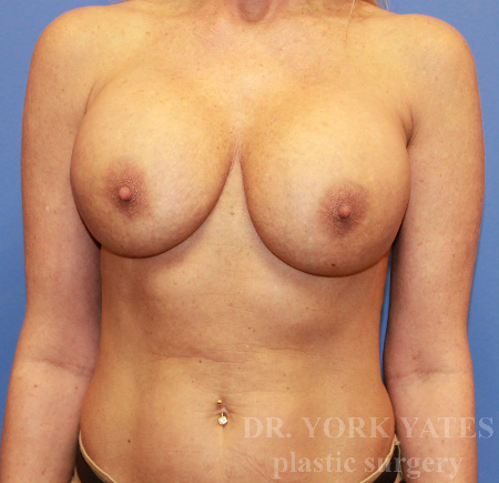 Description: 42 year old female who had saline implant 15 years ago who developed implant malposition, rippling, and capsular contracture. She is shown before and one year after breast augmentation revision consisting of capsulectomy, implant pocket modification, removal of 400 cc saline implants and replacement with 495 cc silicone implants.